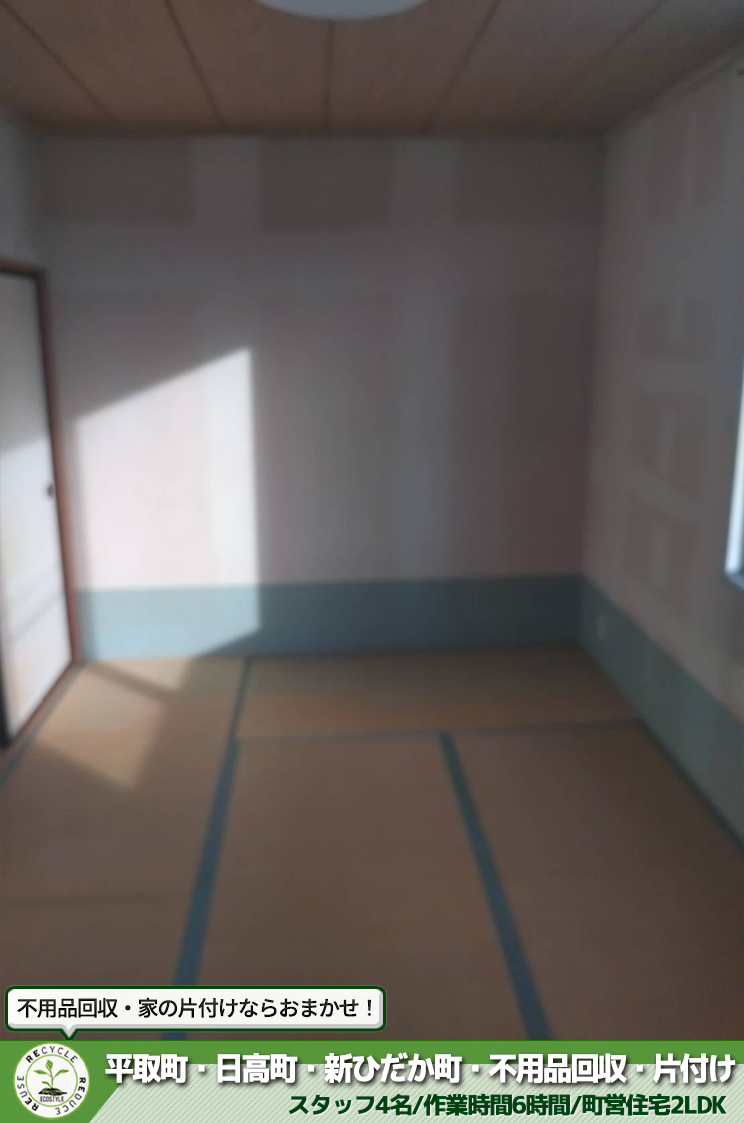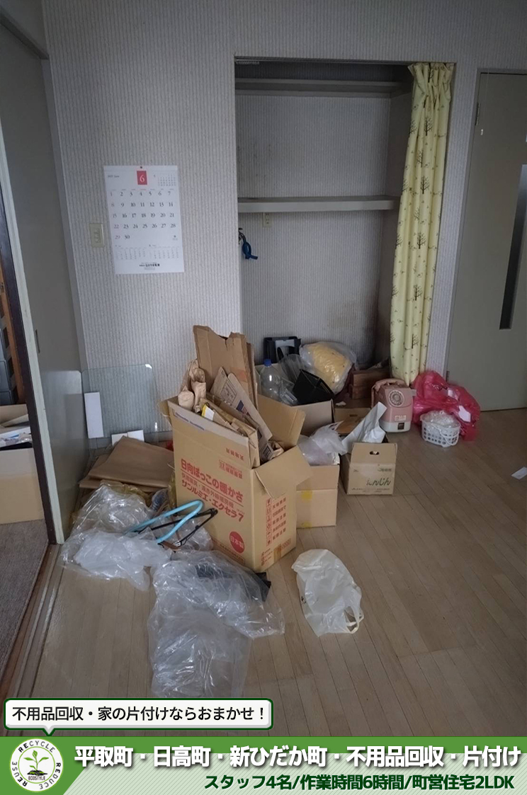生活応援エコスタイルでは不用品回収・遺品整理・家の片付けを行っております。 今回は、平取町で町営住宅の片付け作業をさせて頂きました。