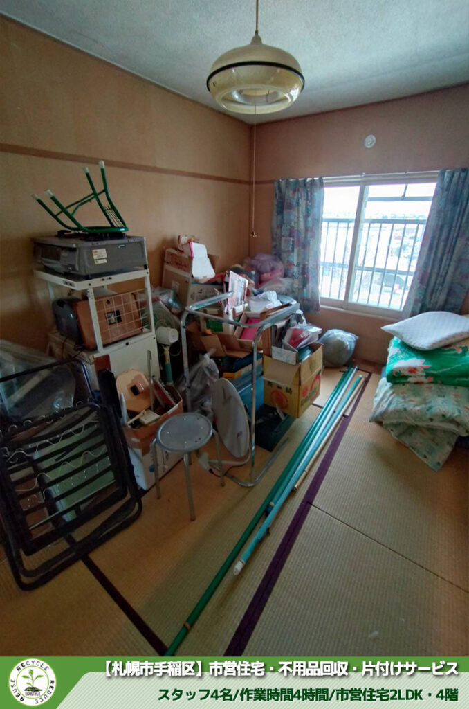 不用品回収や遺品整理の片付け現場実績多数!今回は札幌市手稲区分譲マンションの不用品回収をさせて頂きました。スタッフ4名/作業時間4時間/市営住宅2LDK・4階