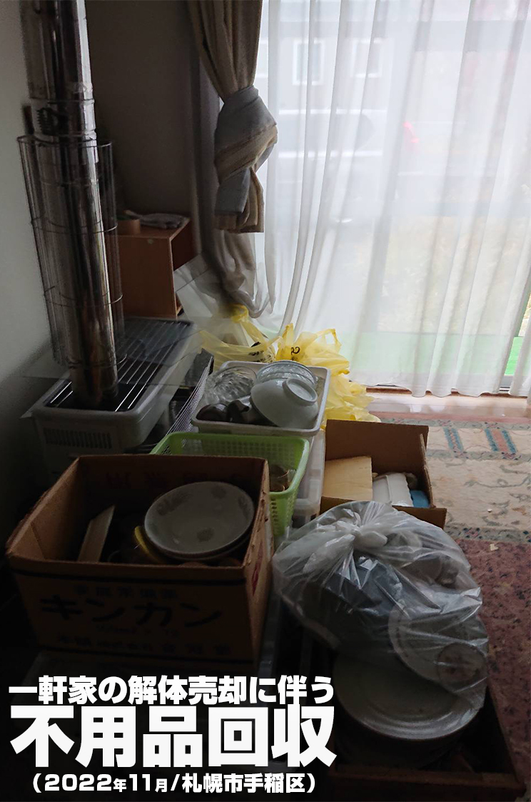 不用品回収・遺品整理の「生活応援エコスタイル」です。今回は札幌市手稲区で一軒家の解体売却に伴う不用品回収作業をさせていただきました。